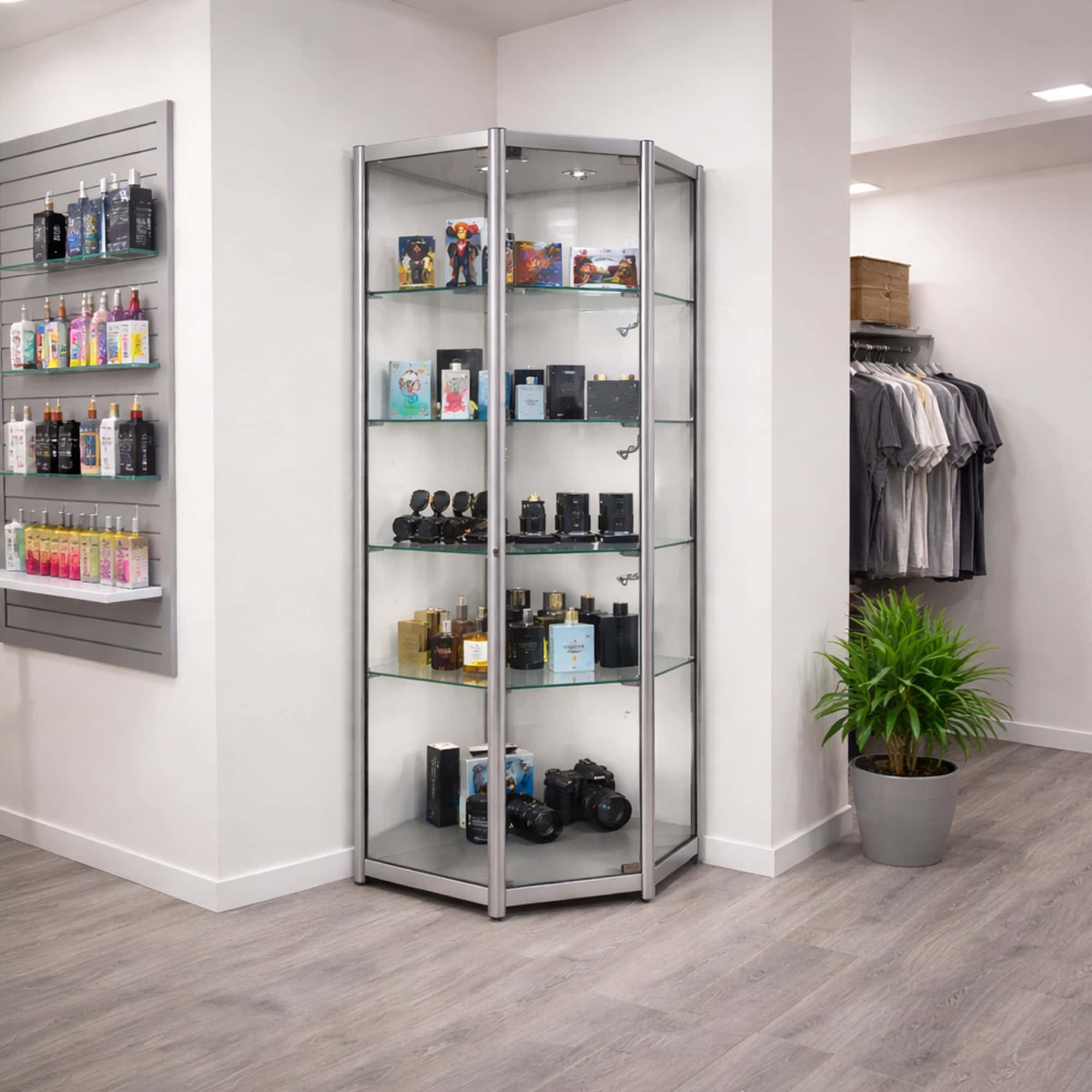 Aluminium & Glass Corner Display Cabinets for Retail Layouts